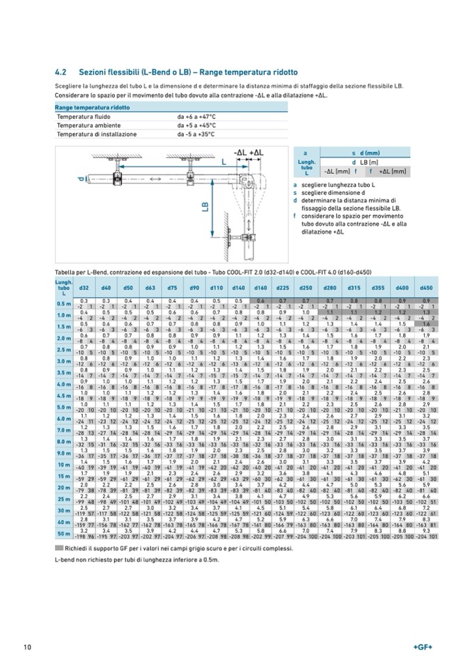 Tabella per L-Bend, contrazione ed espansione del tubo - Tubo COOL-FIT 2.0 (d32-d140) e COOL-FIT 4.0 (d160-d450)