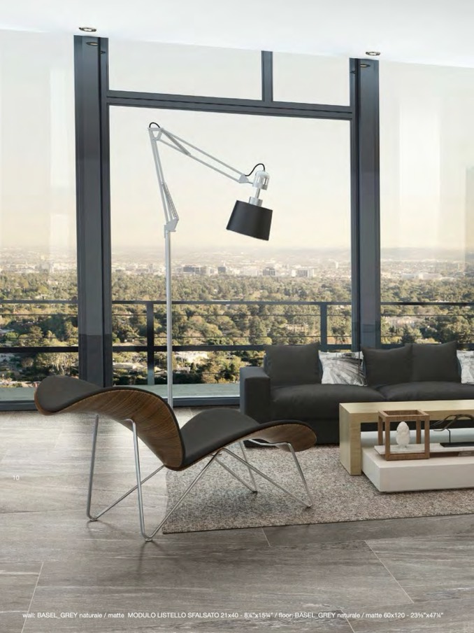 wall: BASEL_GREY naturale / matte MODULO LISTELLO SFALSATO 21x40 - 84”x15p” / floor: BASEL_GREY naturale / matte 60x120 - 23b”x474”