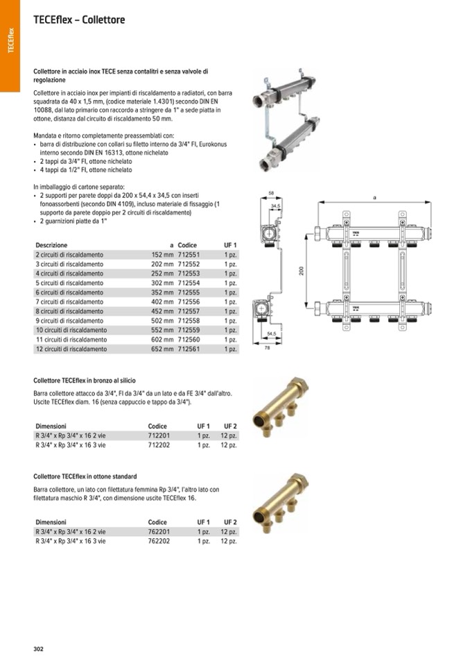 Collettore in acciaio inox TECE senza contalitri e senza valvole di