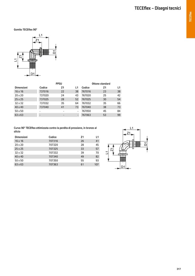 Curva 90° TECEflex ottimizzata contro la perdita di pressione, in bronzo al