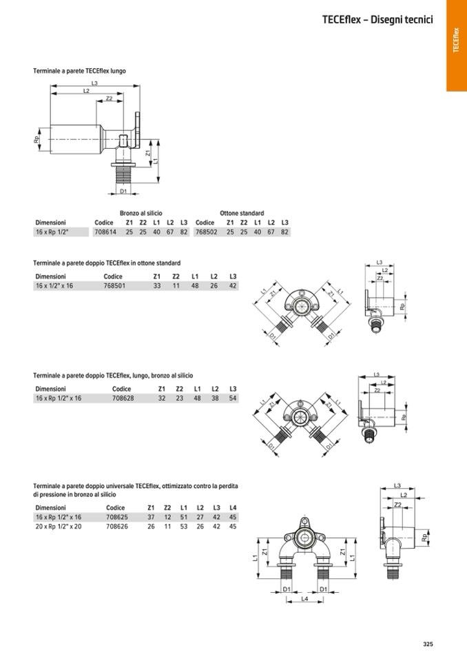 Terminale a parete doppio TECEflex in ottone standard