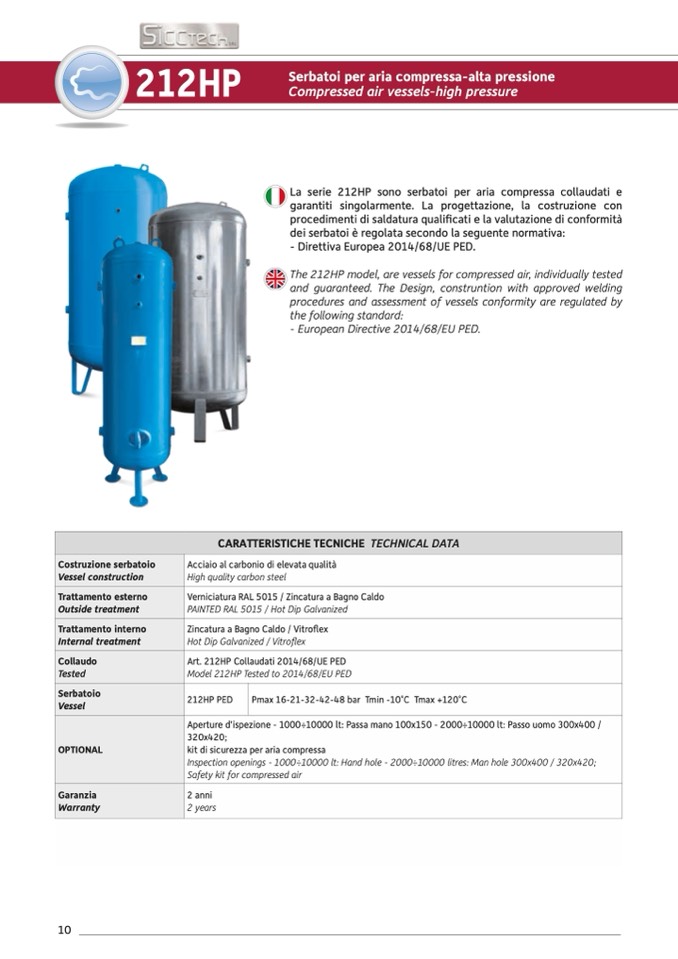 La serie 212HP sono serbatoi per aria compressa collaudati e