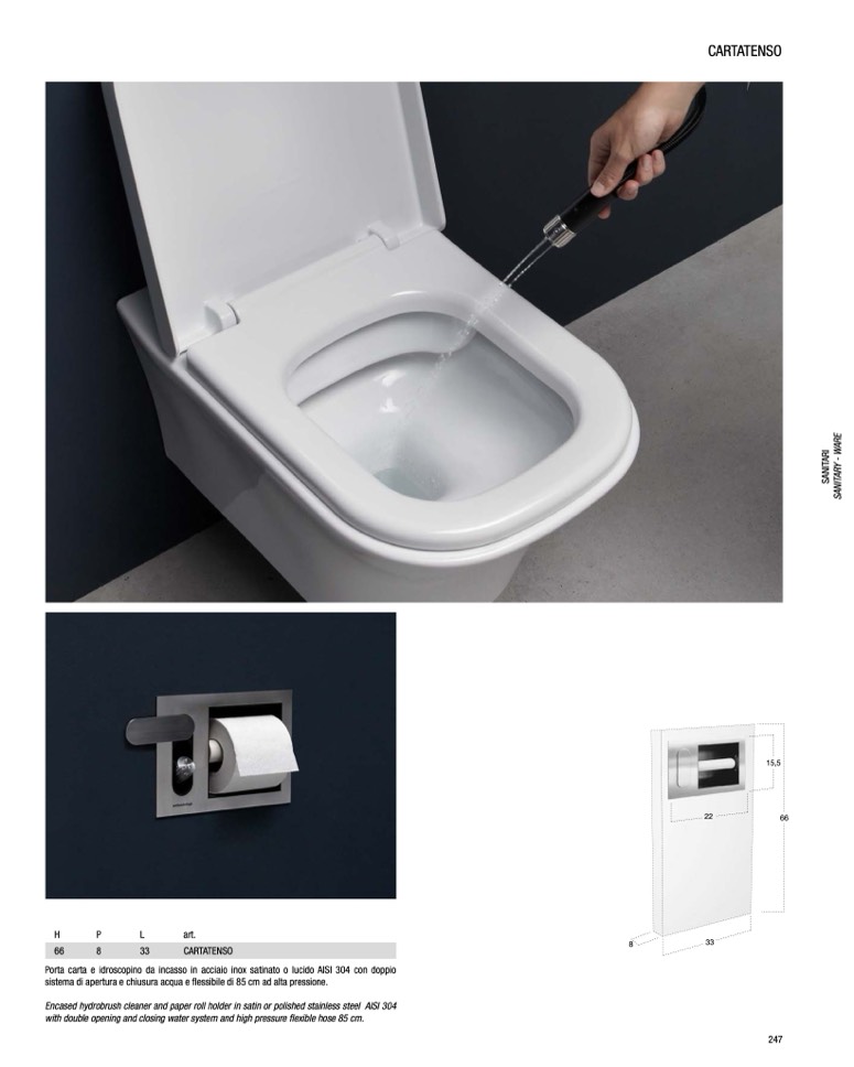 Encased hydrobrush cleaner and paper roll holder in satin or polished stainless steel AISI 304