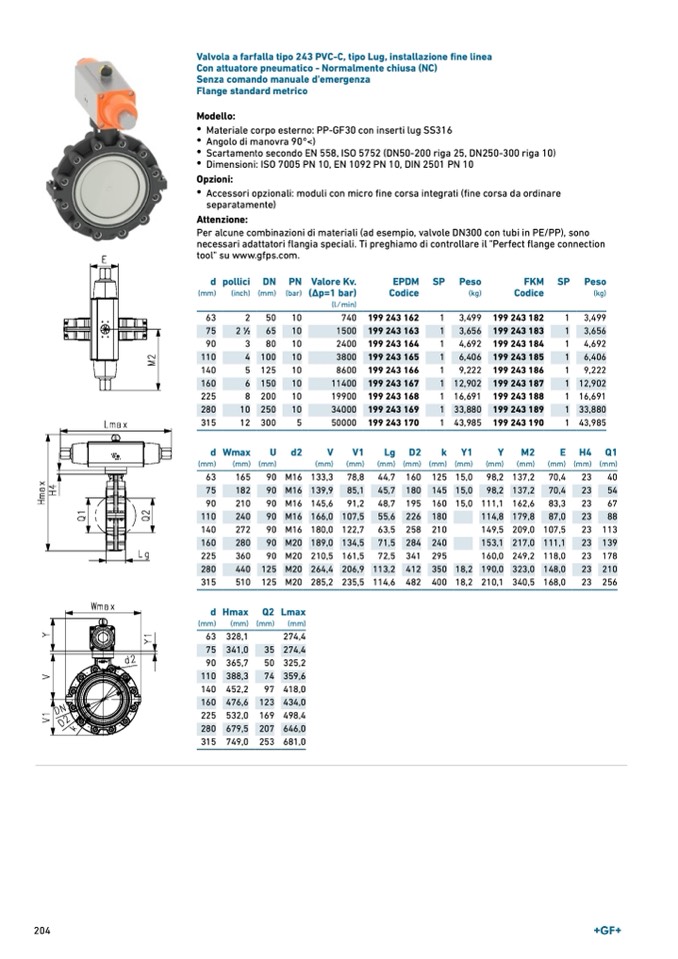 Valvola a farfalla tipo 243 PVC-C, tipo Lug, installazione fine linea