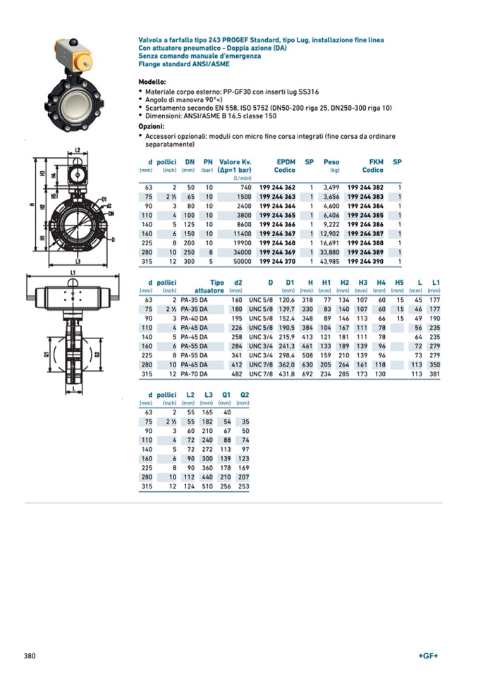 Valvola a farfalla tipo 243 PROGEF Standard, tipo Lug, installazione fine linea