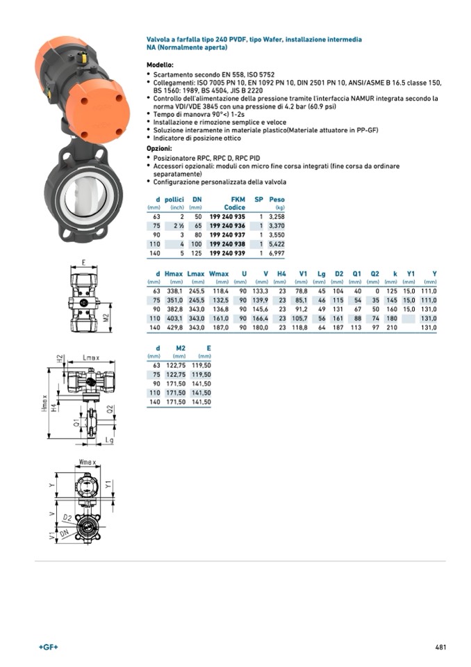 Valvola a farfalla tipo 240 PVDF, tipo Wafer, installazione intermedia
