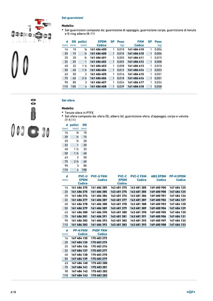 Set sfere composto da: sfera (5), albero (6), guarnizione sfera, d'appoggio, corpo e valvola