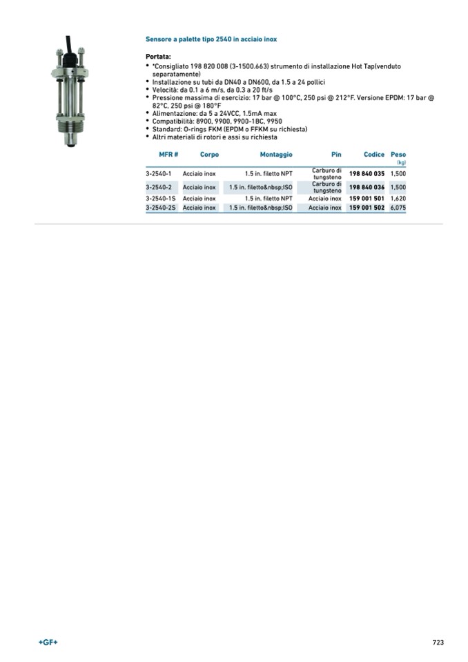 Sensore a palette tipo 2540 in acciaio inox