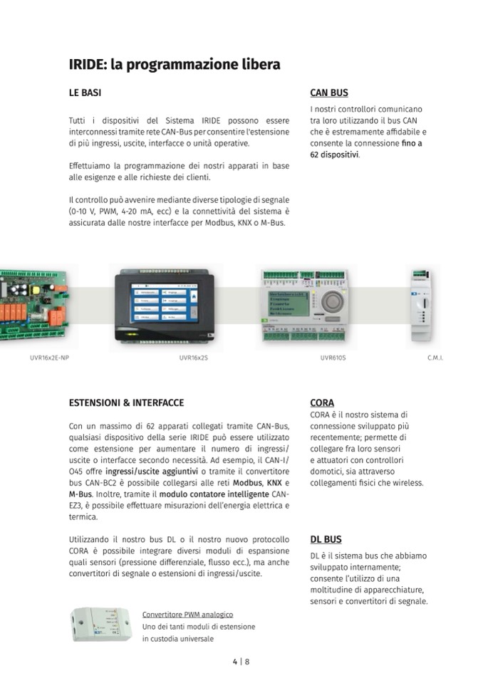 (0-10 V, PWM, 4-20 mA, ecc) e la connettività del sistema