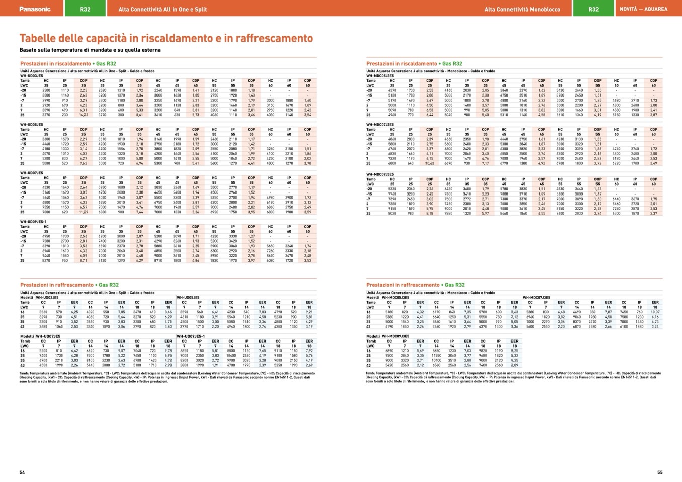(Heating Capacity, (kW) - CC: Capacità di raffrescamento (Cooling Capacity, kW) - IP: Potenza in ingresso (Input Power, kW) - Dati rilevati da Panasonic secondo norme EN14511-2, Questi dati
