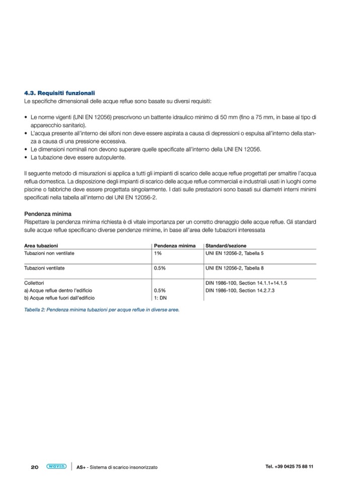 sulle acque reflue specificano diverse pendenze minime, in base all’area delle tubazioni interessata