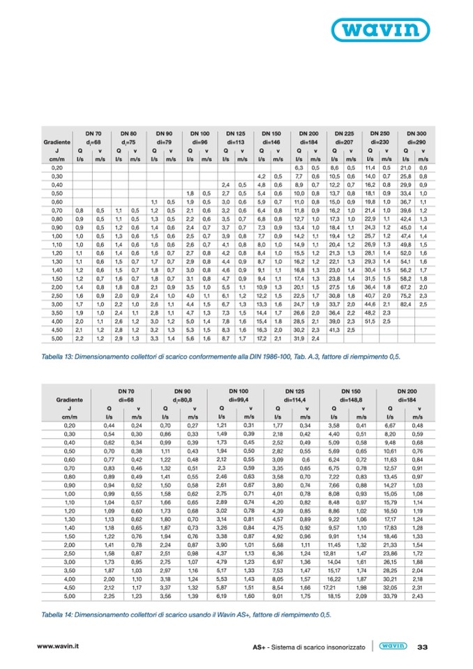 Tabella 14: Dimensionamento collettori di scarico usando il Wavin AS+, fattore di riempimento 0,5.