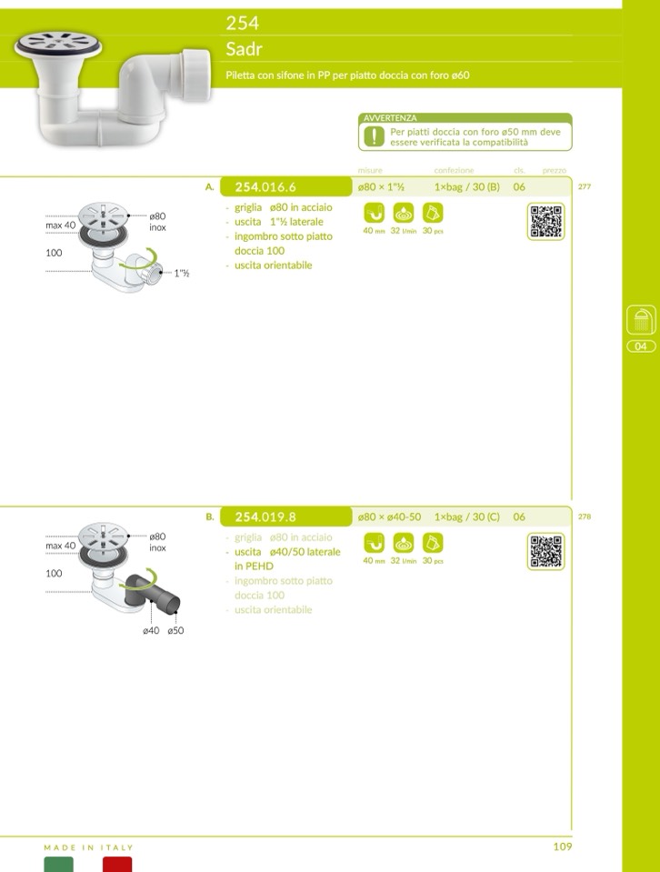 Piletta con sifone in PP per piatto doccia con foro ø6