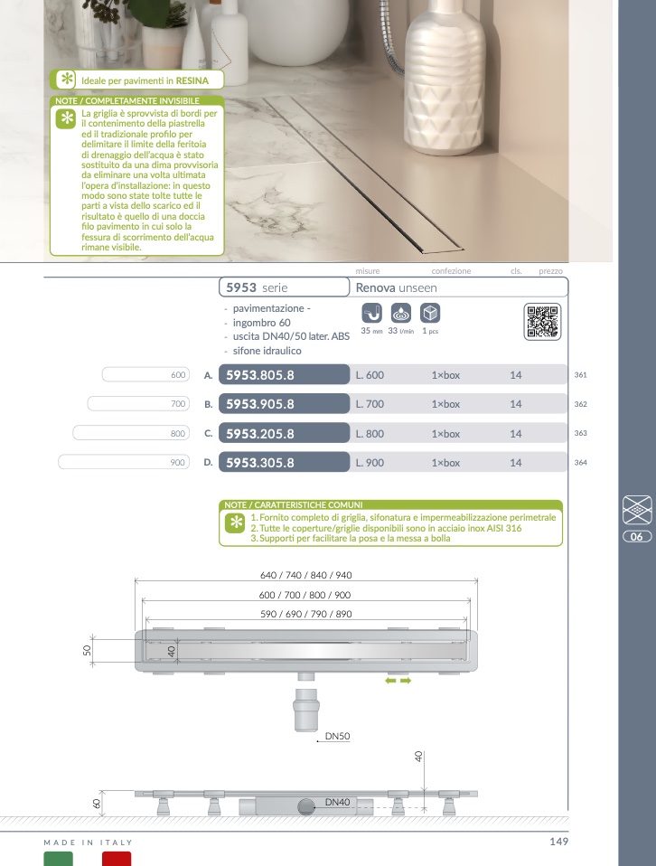 1. Fornito completo di griglia, sifonatura e impermeabilizzazione perimetral