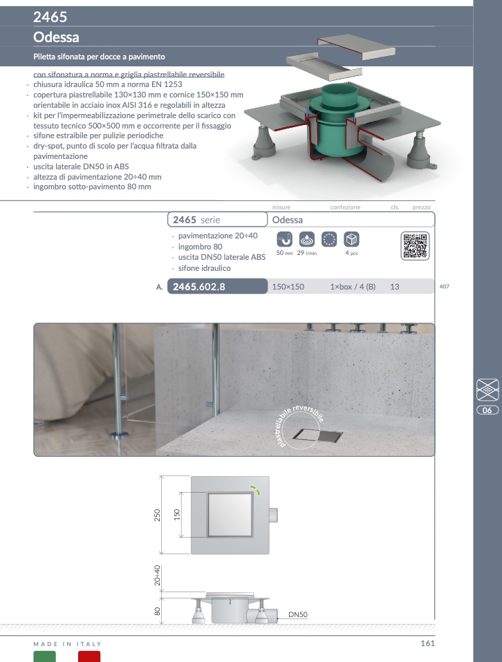 con sifonatura a norma e griglia piastrellabile reversibil