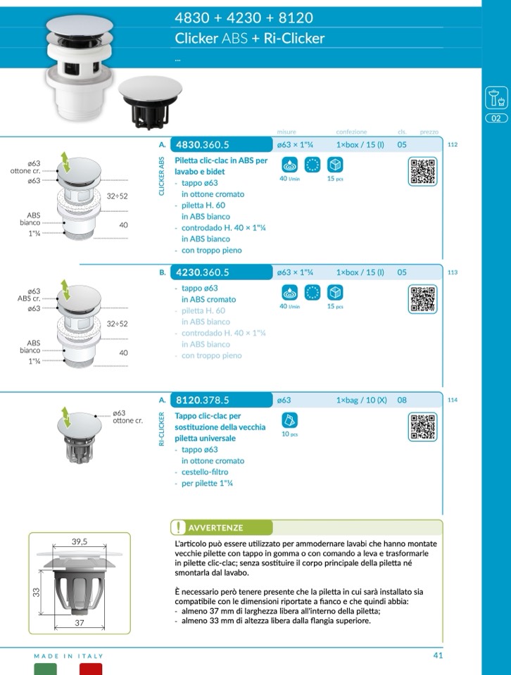 - almeno 37 mm di larghezza libera all'interno della piletta;