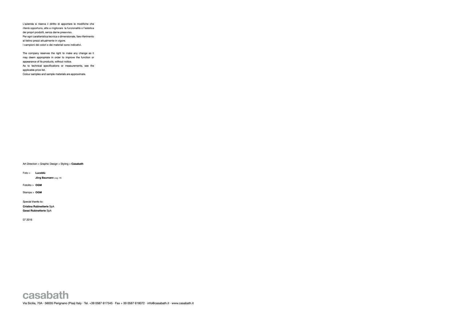 Via Sicilia, 70A · 56035 Perignano (Pisa) Italy · Tel. +39 0587 617345 · Fax + 39 0587 618072 · info@casabath.it · www.casabath.it