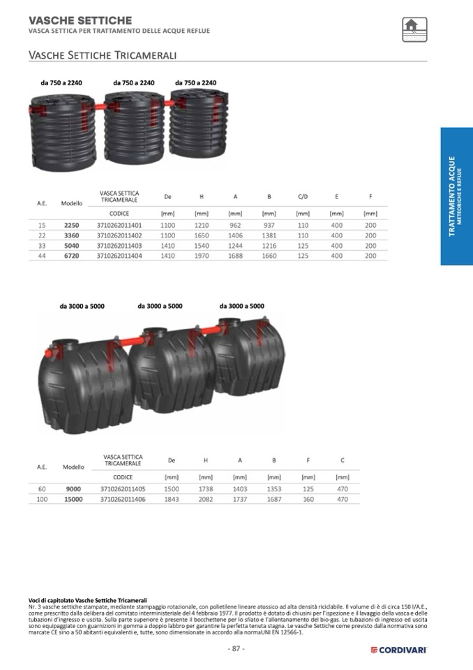 Nr. 3 vasche settiche stampate, mediante stampaggio rotazionale, con polietilene lineare atossico ad alta densità riciclabile. Il volume di è di circa 150 l/A.E.,