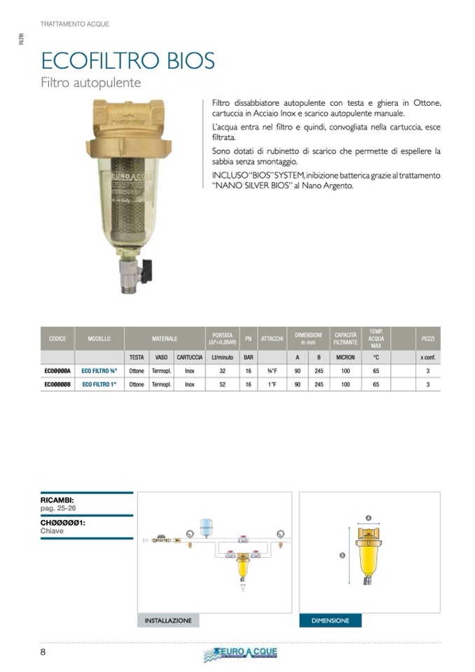 cartuccia in Acciaio Inox e scarico autopulente manuale.