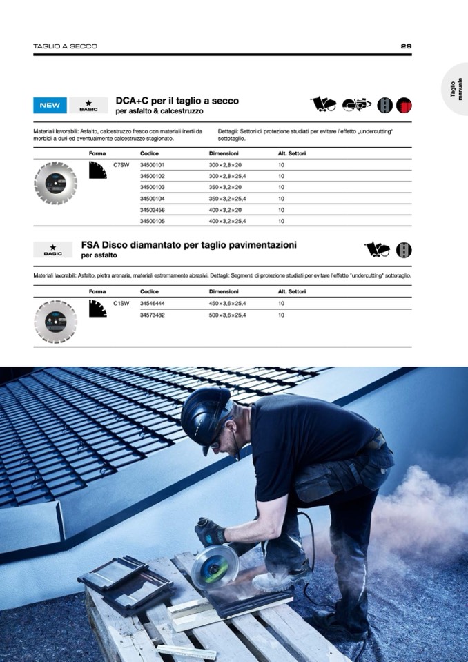 Materiali lavorabili: Asfalto, pietra arenaria, materiali estremamente abrasivi. Dettagli: Segmenti di protezione studiati per evitare l'effetto "undercutting" sottotaglio.