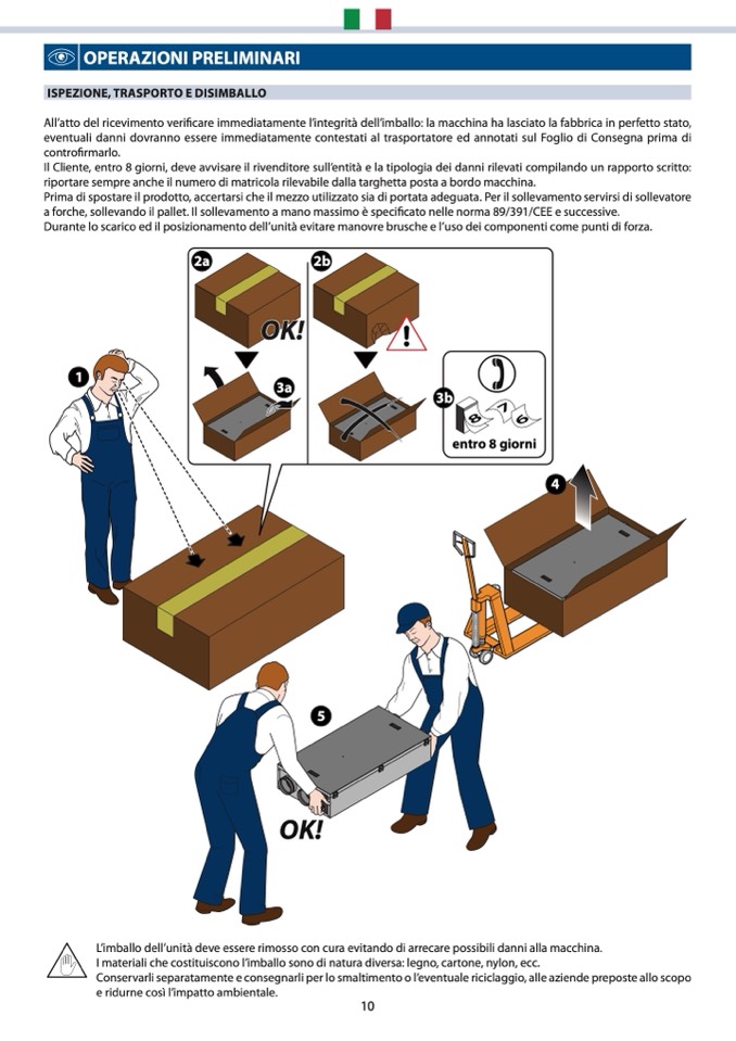 All’atto del ricevimento verificare immediatamente l’integrità dell’imballo: la macchina ha lasciato la fabbrica in perfetto stato,