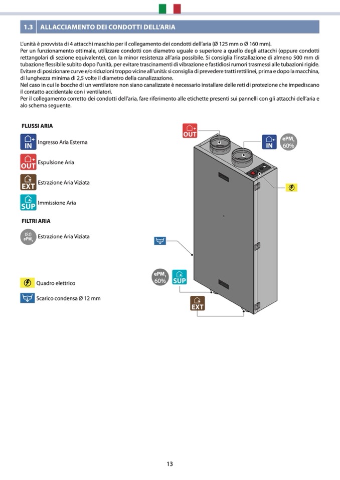 L’unità è provvista di 4 attacchi maschio per il collegamento dei condotti dell’aria (Ø 125 mm o Ø 160 mm).