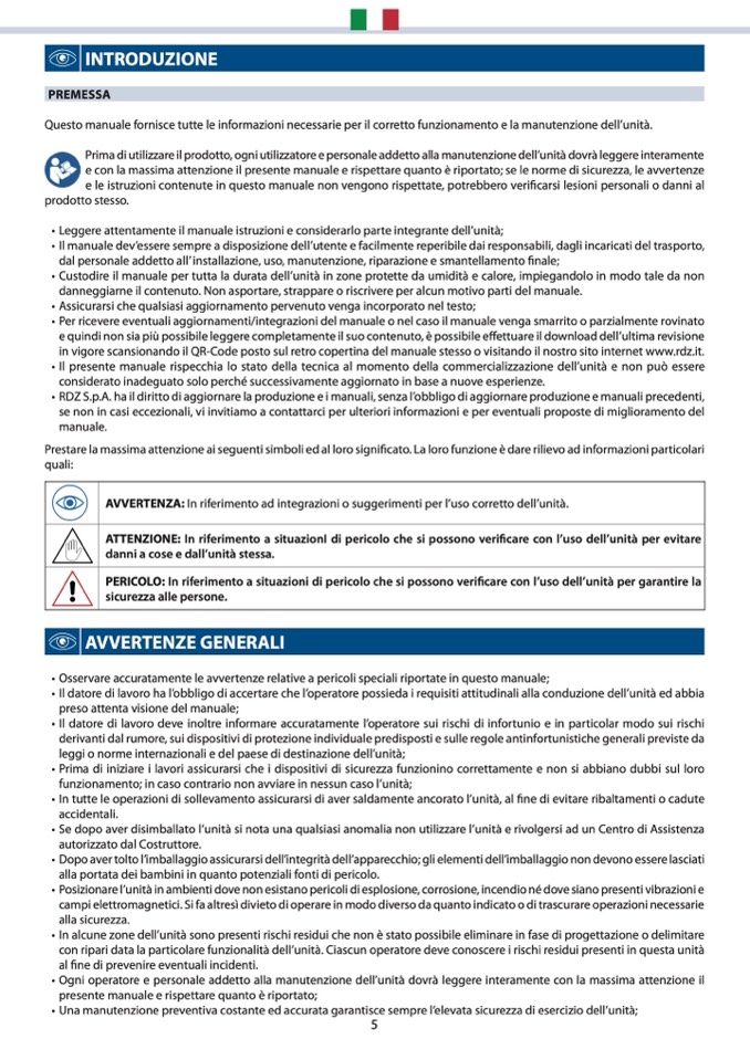 in vigore scansionando il QR-Code posto sul retro copertina del manuale stesso o visitando il nostro sito internet www.rdz.it