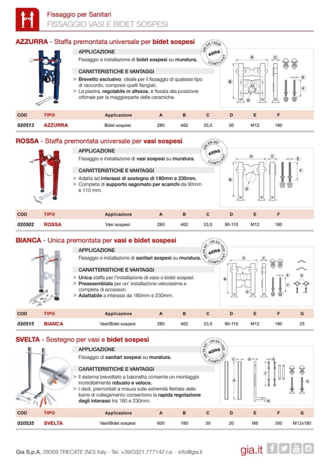 Unica staffa per l’installazione di vaso o bidet sospesi.