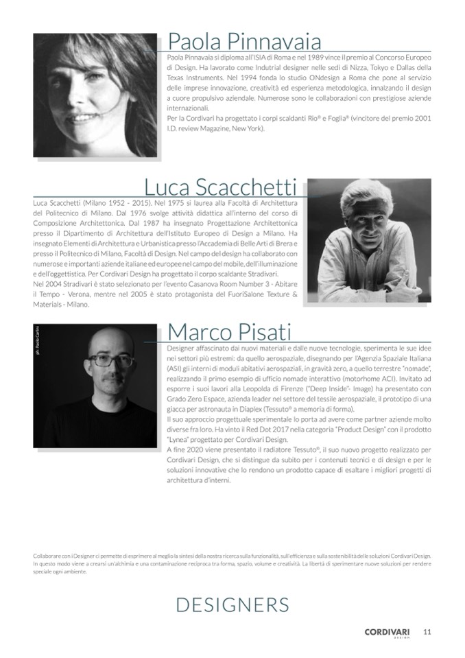 e dell’oggettistica. Per Cordivari Design ha progettato il corpo scaldante Stradivari.