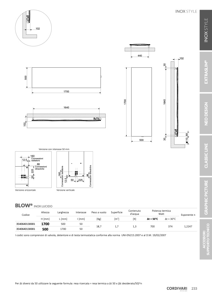 Per Δt diversi da 50 utilizzare la seguente formula: resa ricercata = resa termica a Δt 50 x (Δt desiderato/50)^n