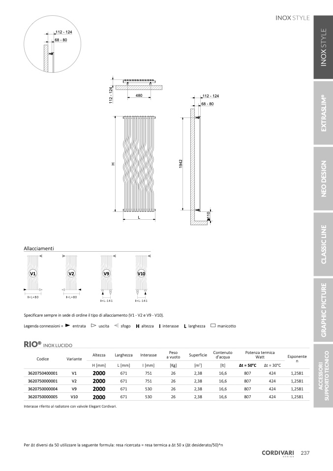 Per Δt diversi da 50 utilizzare la seguente formula: resa ricercata = resa termica a Δt 50 x (Δt desiderato/50)^n