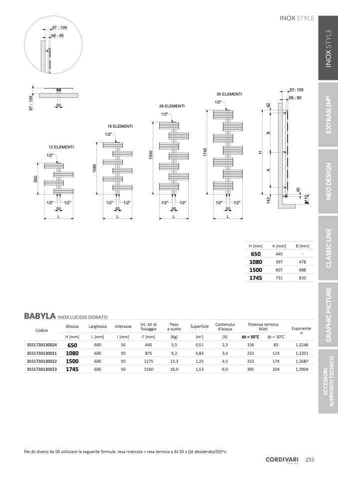 Per Δt diversi da 50 utilizzare la seguente formula: resa ricercata = resa termica a Δt 50 x (Δt desiderato/50)^n