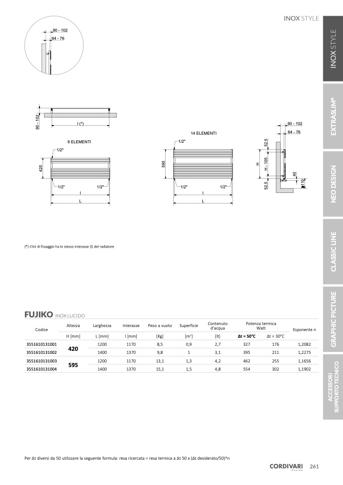 Per Δt diversi da 50 utilizzare la seguente formula: resa ricercata = resa termica a Δt 50 x (Δt desiderato/50)^n