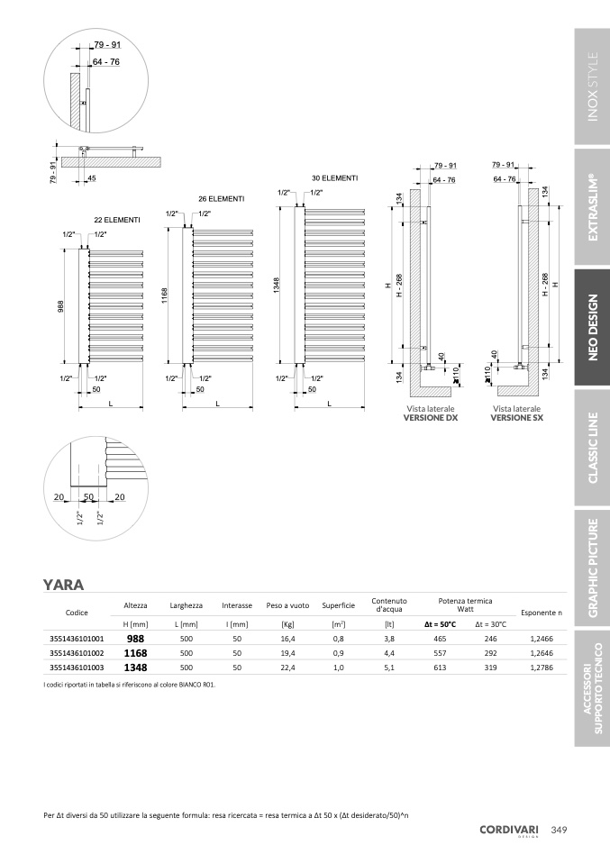 Per Δt diversi da 50 utilizzare la seguente formula: resa ricercata = resa termica a Δt 50 x (Δt desiderato/50)^n