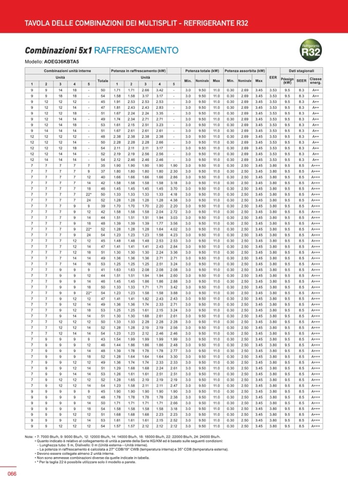 - La potenza in raffrescamento è calcolata a 27° CDB/19° CWB (temperatura interna) e 35° CDB (temperatura esterna).