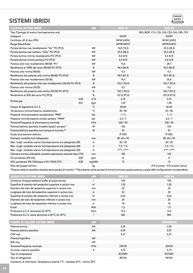 *Potenza elettrica assorbita calcolata senza pompa di ricircolo / **Se presente anche pompa di ricircolo sommare questa potenza a quella della configurazione corrispondente