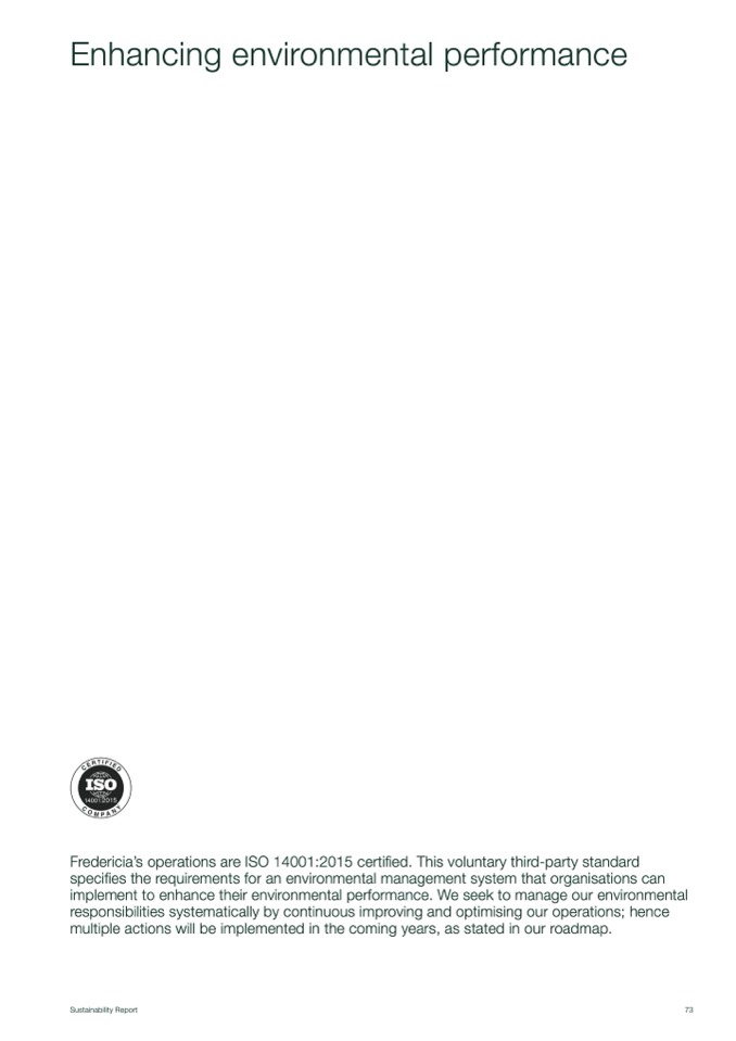 Fredericia’s operations are ISO 14001:2015 certified. This voluntary third-party standard