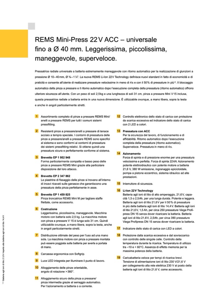 ulteriore sicurezza all’utente. Con un peso di soli 2,5 kg e una lunghezza di soli 31 cm, pinza a pressare Mini V 15 inclusa,