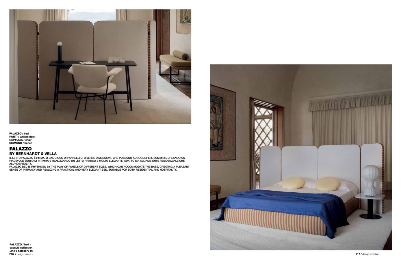 PALAZZO BED IS RHYTHMED BY THE PLAY OF PANELS OF DIFFERENT SIZES, WHICH CAN ACCOMMODATE THE BASE, CREATING A PLEASANT