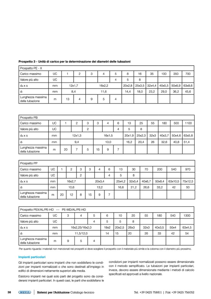 Prospetto 3 - Unità di carico per la determinazione dei diametri delle tubazioni