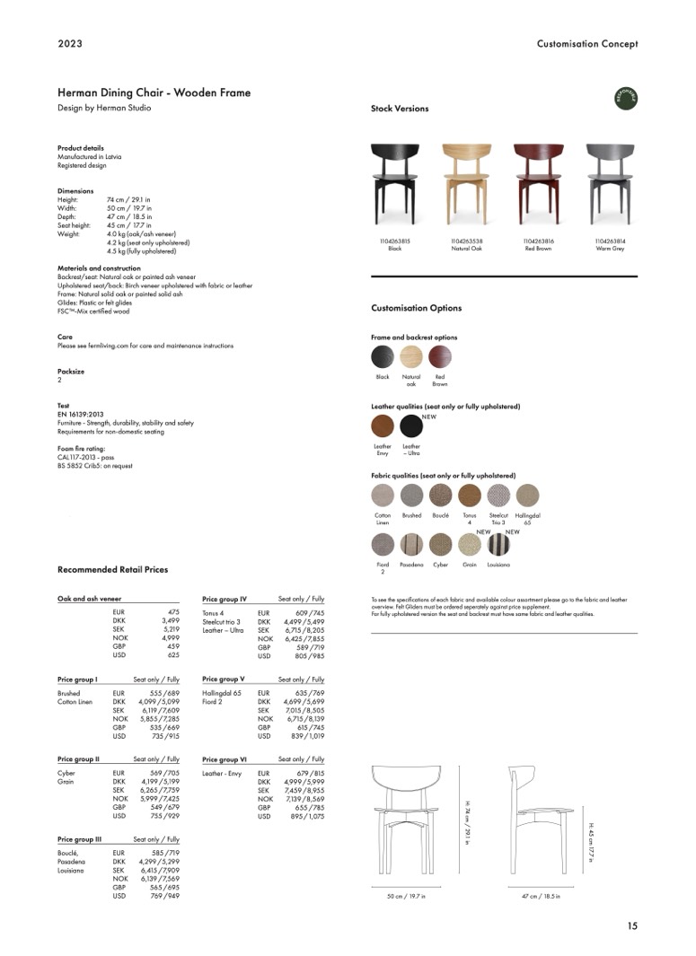 For fully upholstered version the seat and backrest must have same fabric and leather qualities.