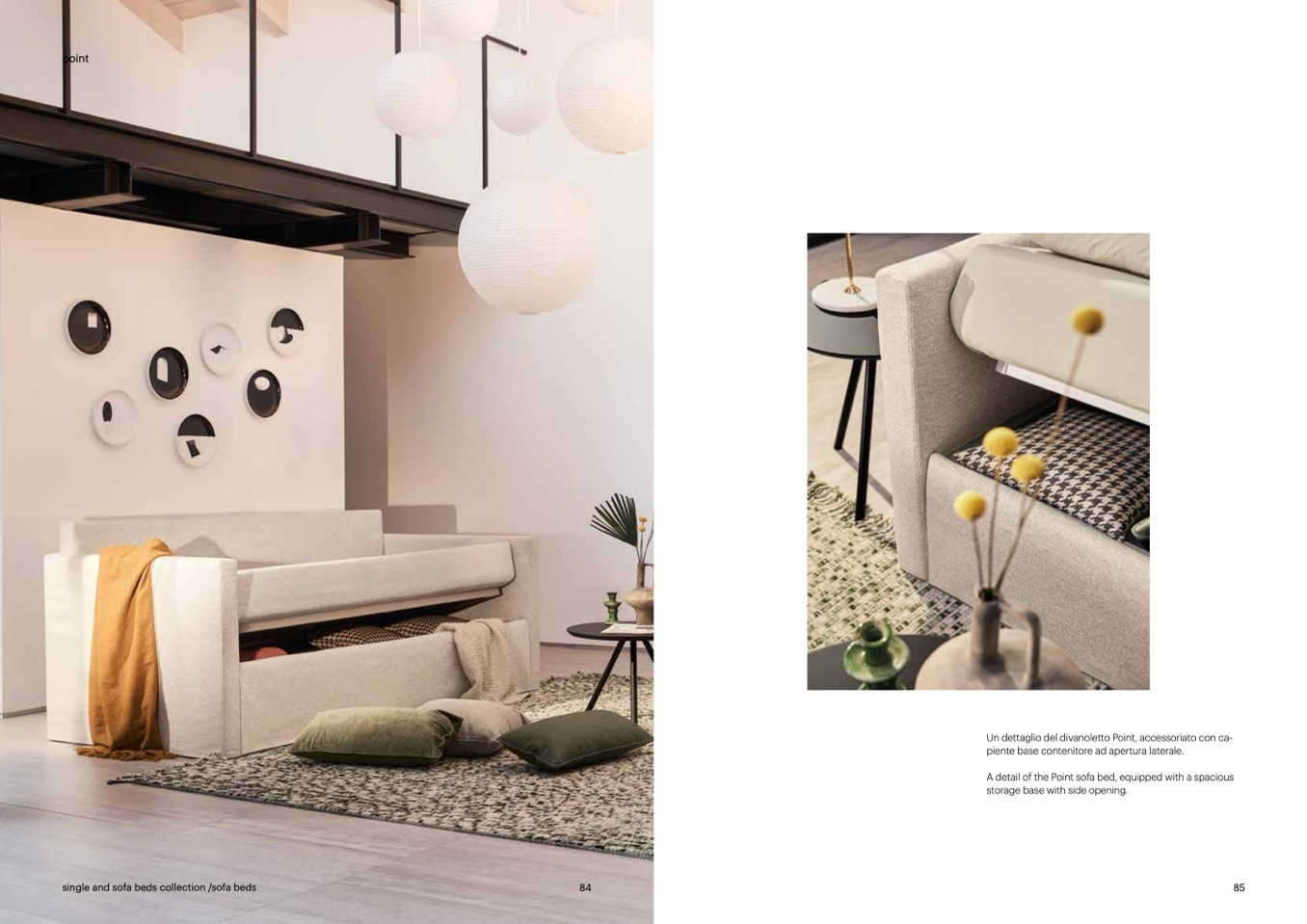 Un dettaglio del divanoletto Point, accessoriato con ca-