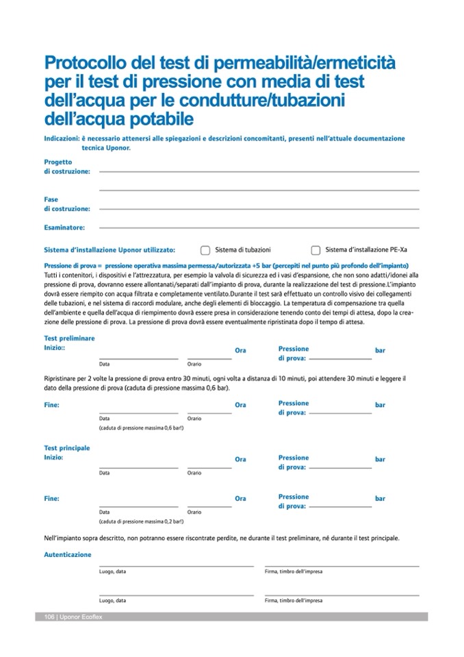 pressione di prova, dovranno essere allontanati/separati dall’impianto di prova, durante la realizzazione del test di pressione.L’impianto