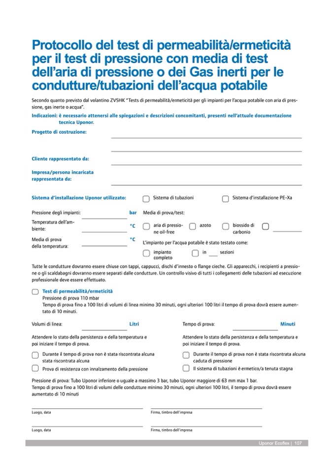 Secondo quanto previsto dal volantino ZVSHK “Tests di permeabilità/ermeticità per gli impianti per l’acqua potabile con aria di pres-