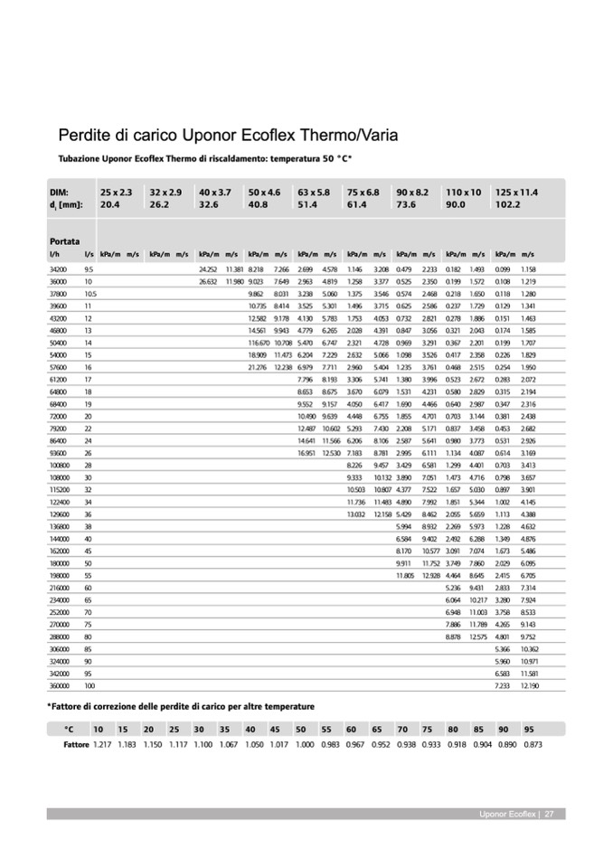 *Fattore di correzione delle perdite di carico per altre temperature
