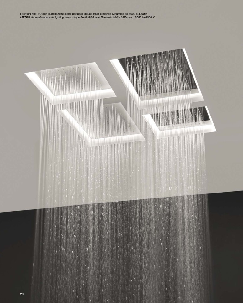 METEO showerheads with lighting are equipped with RGB and Dynamic White LEDs from 3000 to 4000 K