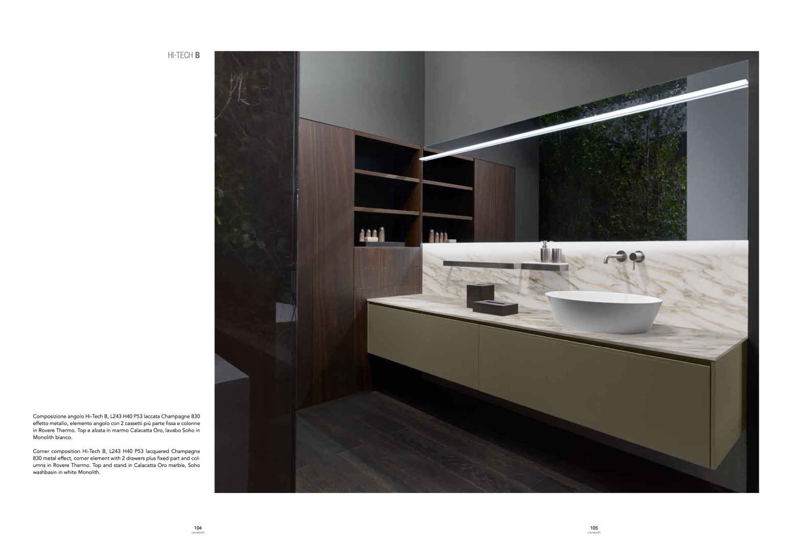 in Rovere Thermo. Top e alzata in marmo Calacatta Oro, lavabo Soho in