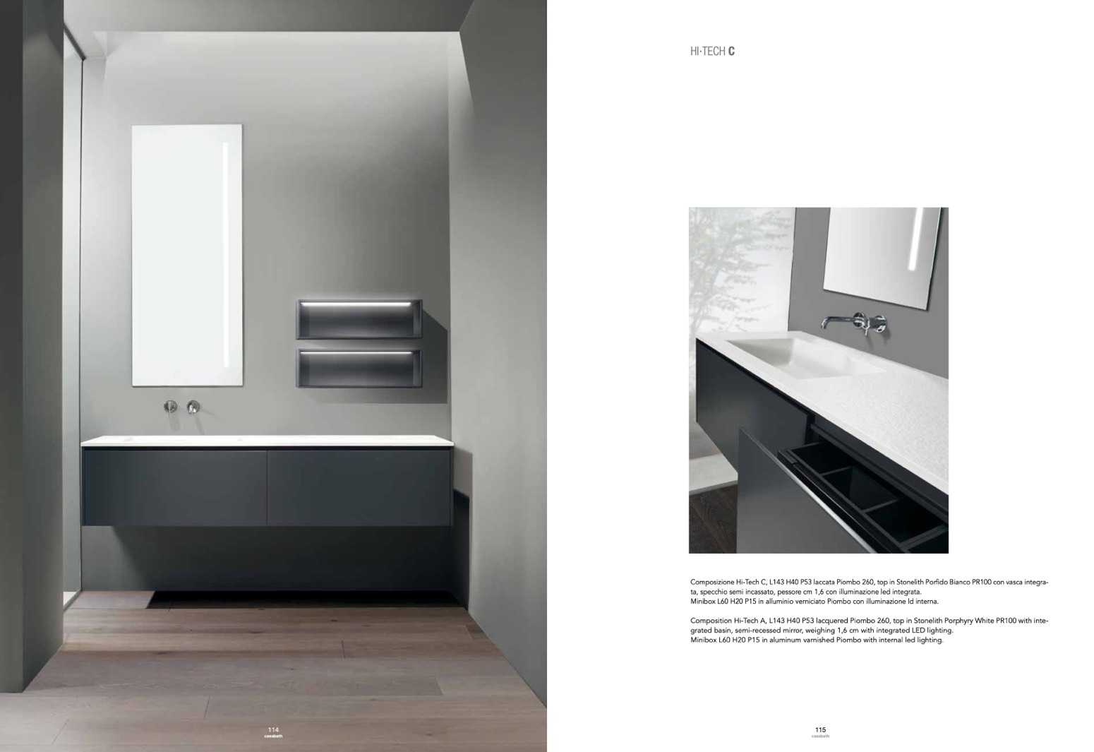 grated basin, semi-recessed mirror, weighing 1,6 cm with integrated LED lighting.
