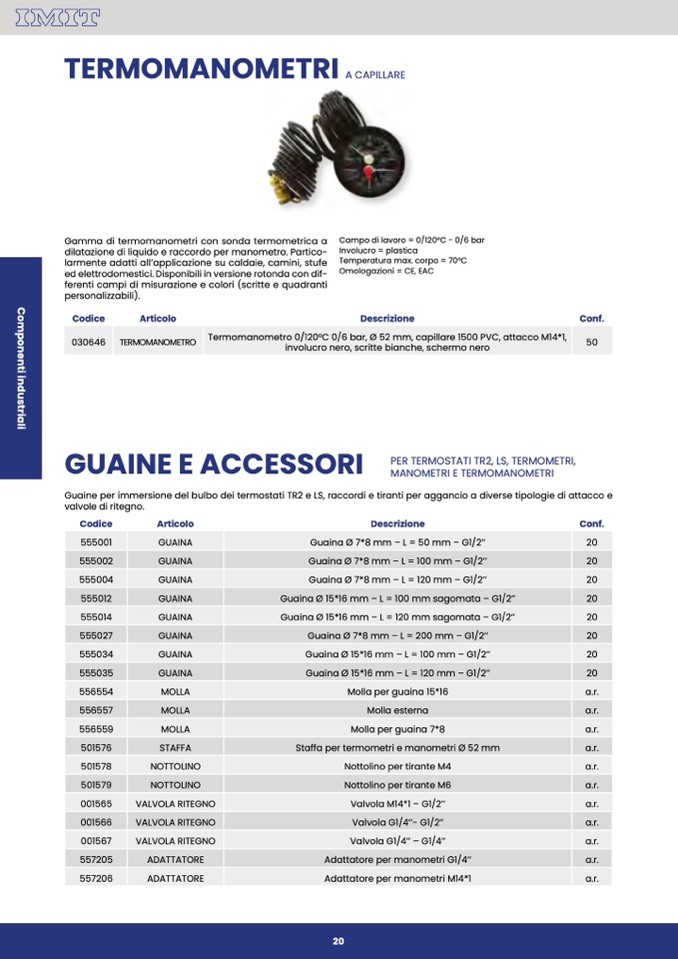 Guaine per immersione del bulbo dei termostati TR2 e LS, raccordi e tiranti per aggancio a diverse tipologie di attacco e