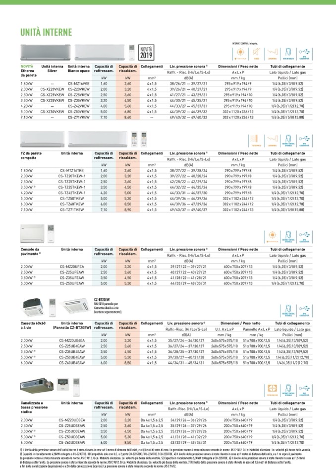 2) Capacità in riscaldamento 4,20kW collegata a CU-2Z35TBE. 3) Compatibile solo con U.E. a 2 porte CU-2Z35TBE / CU-2Z41TBE / CU-2Z50TBE. 4) Il livello della pressione sonora è stato rilevato in asse ad 1 metro di distanza dall’unità, e a 1 m sopra il pavimento.